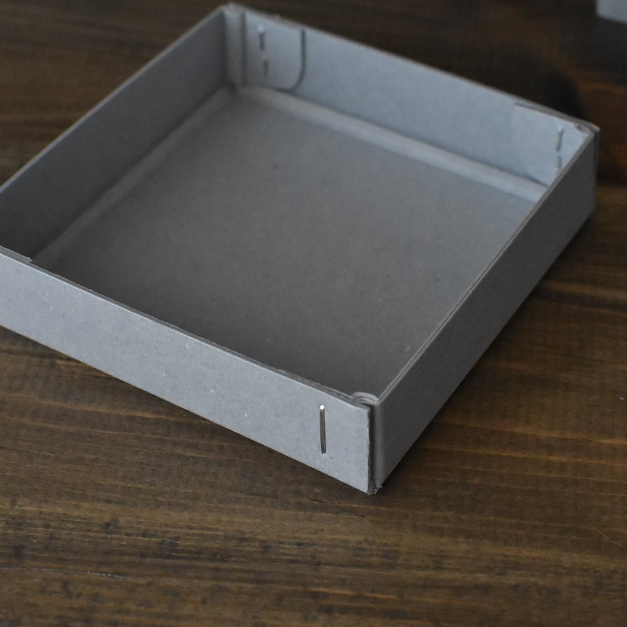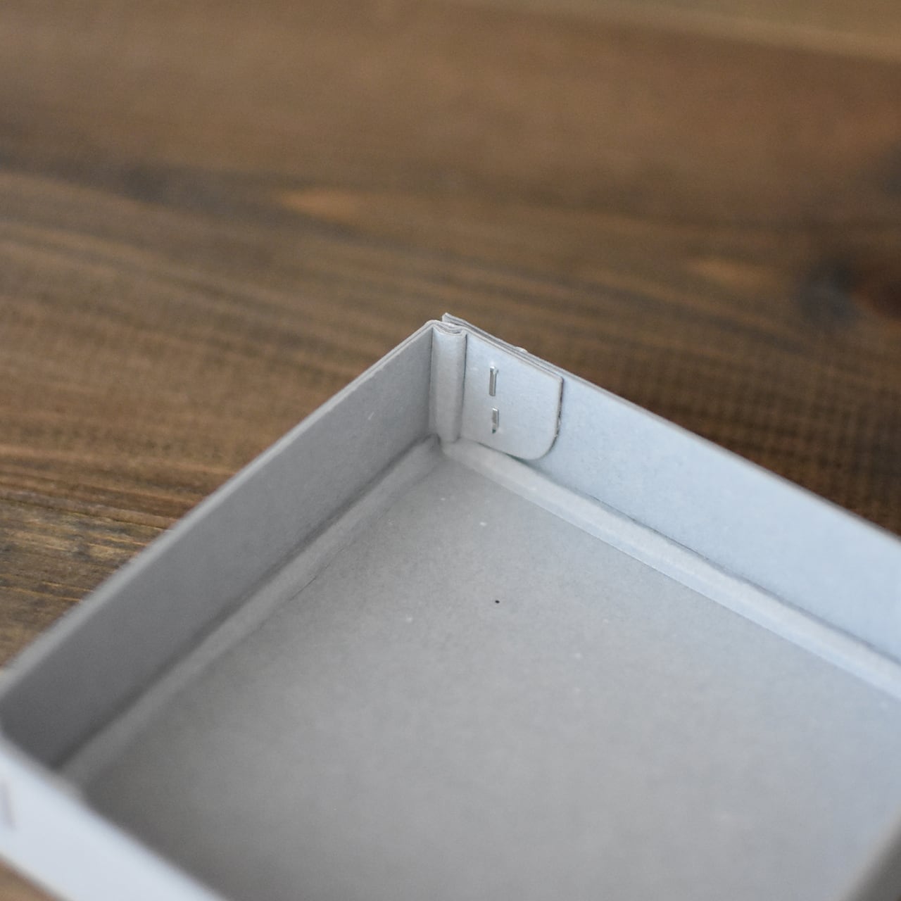 蓋と身が分かれる、角をホチキス止めする簡易な形式ですが、