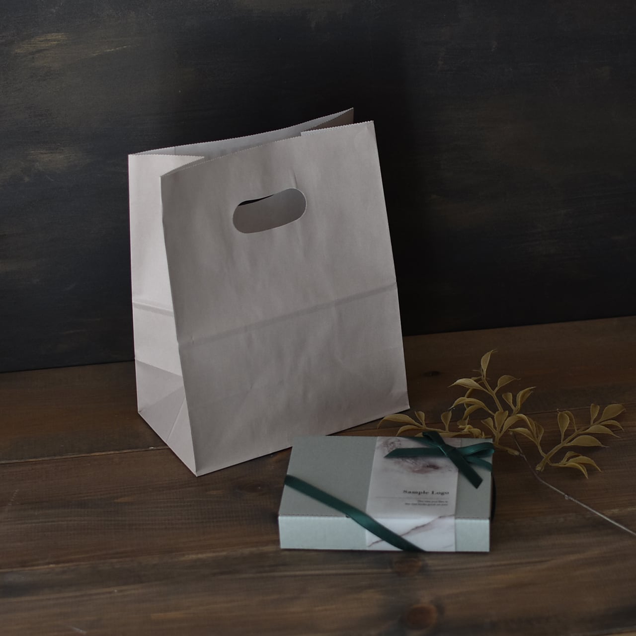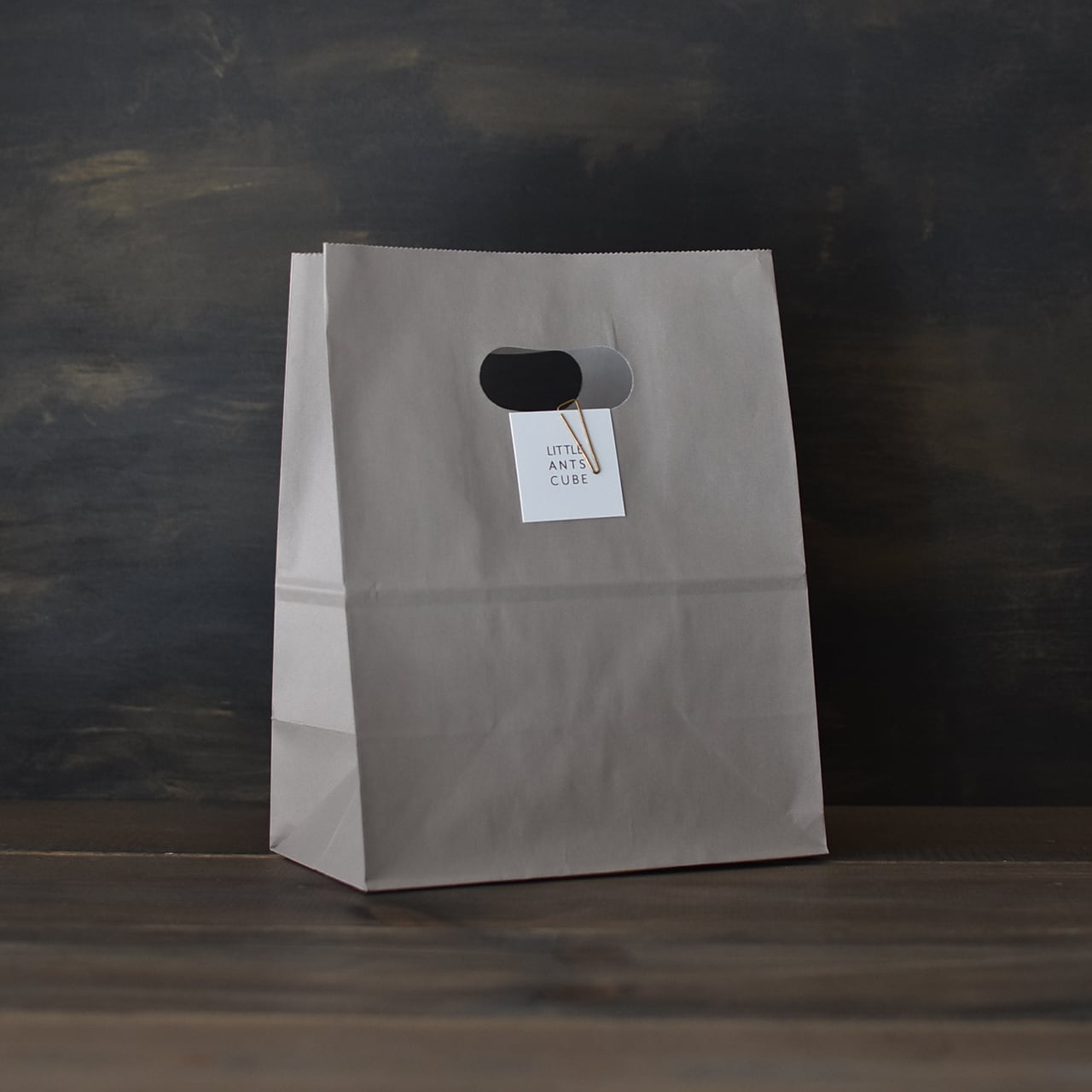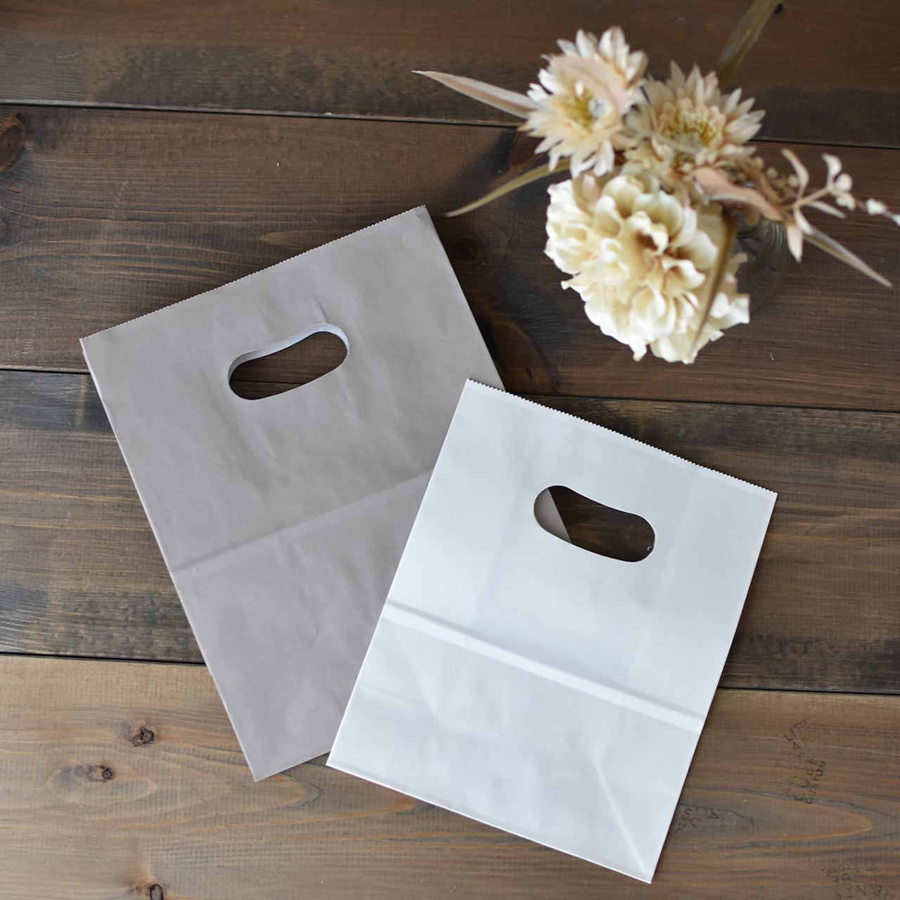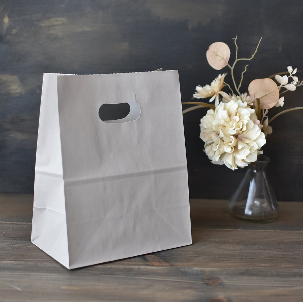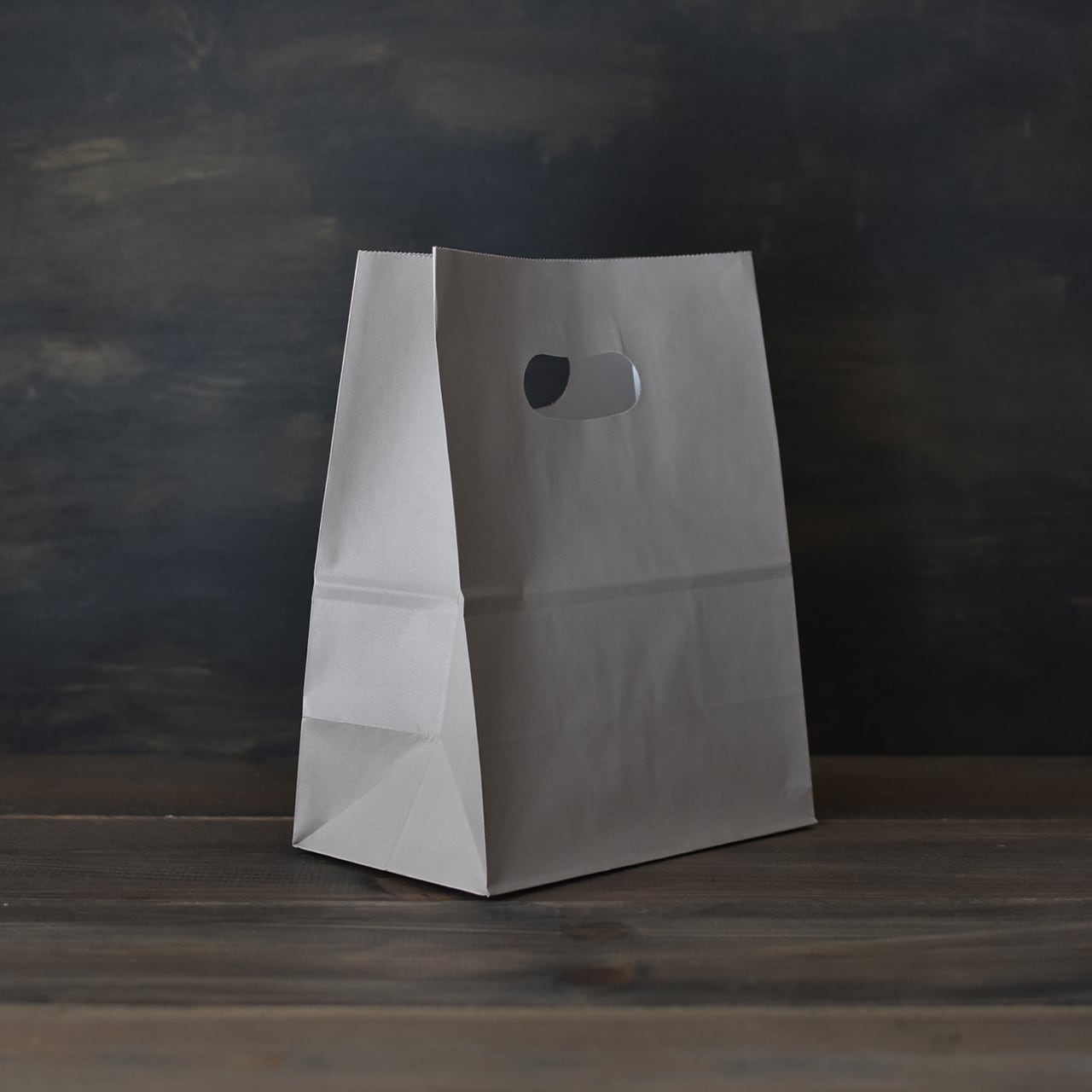 おしゃれなグレージュカラーが可愛い、手穴付きの紙袋です。
